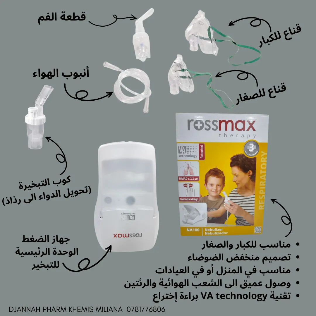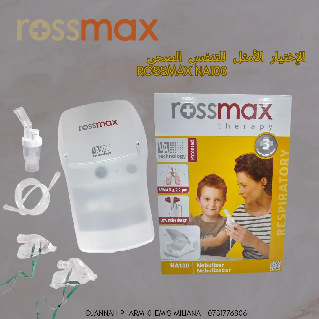 جهاز تبخيرة (Nebulizer) من شركة Rossmax، موديل NA100، ويُستخدم في علاج أمراض الجهاز التنفسي مثل الربو أو التهابات الشعب الهوائية عن طريق تحويل الدواء السائل إلى رذاذ يُستنشق بسهولة.